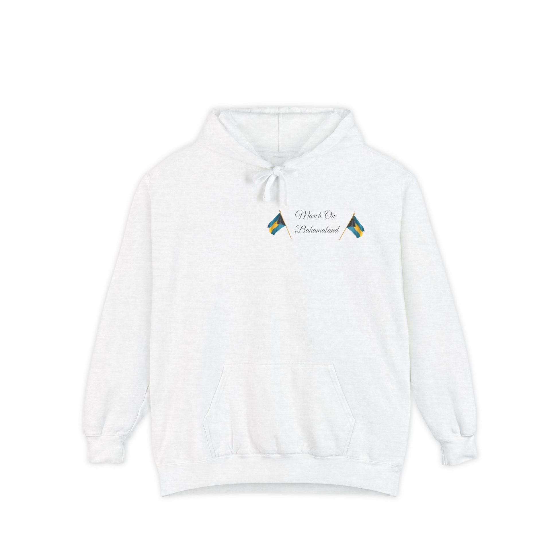 This hoodie carries the quiet pride of island life. The Bahamas coat of arms and the Pledge are printed with care on a garment-dyed, substantial fabric that drapes easily and feels warm against the skin. It settles into a relaxed silhouette — the kind you reach for after long days of sun and sea, or on cool evenings when the breeze carries salt and stories. Thoughtful details like a jersey-lined hood, sturdy drawstrings, and a half-moon back patch make it feel lived-in and reliable. Wear it to remember home, to celebrate national moments, or simply to add a touch of Bahamian identity to everyday routines.
